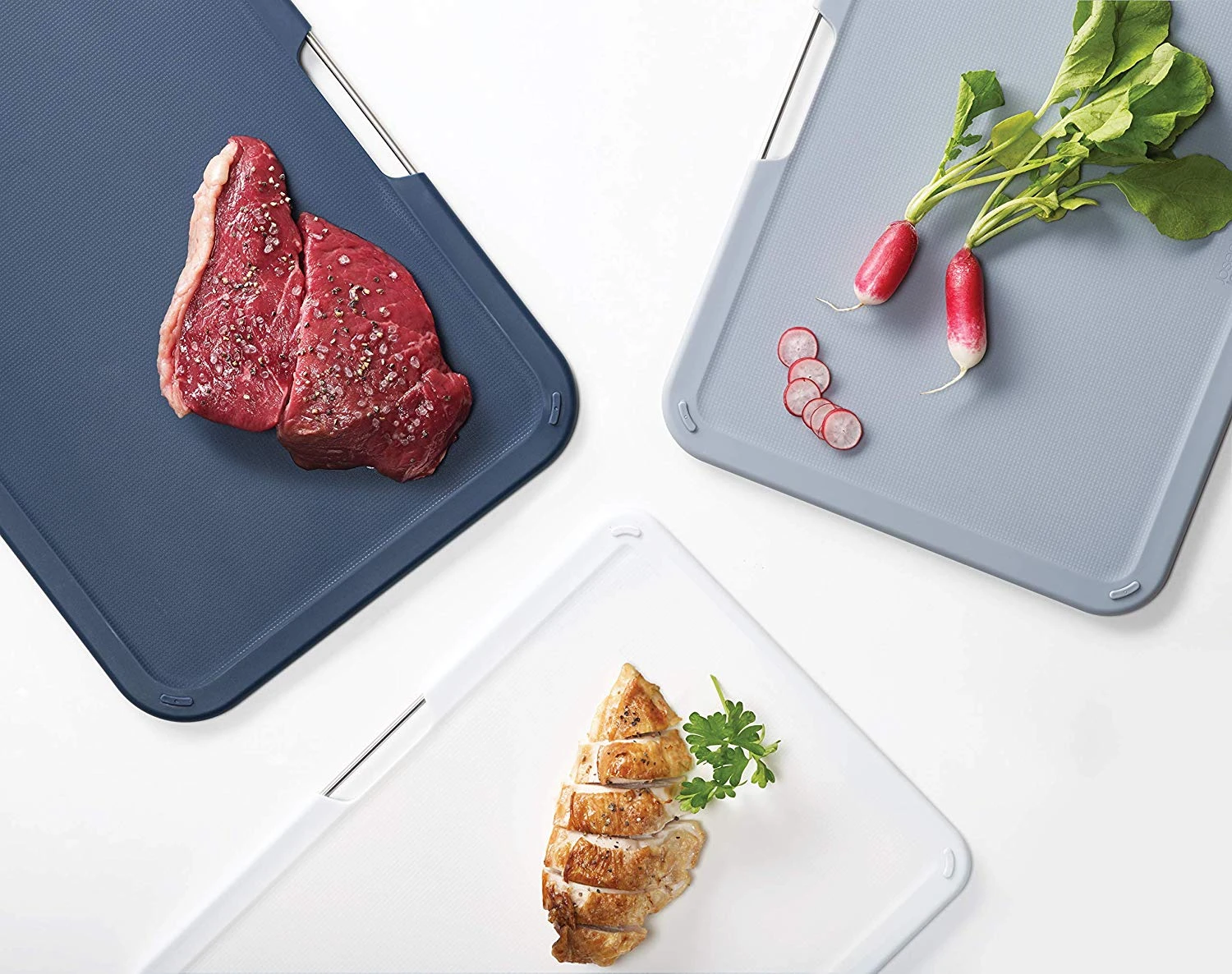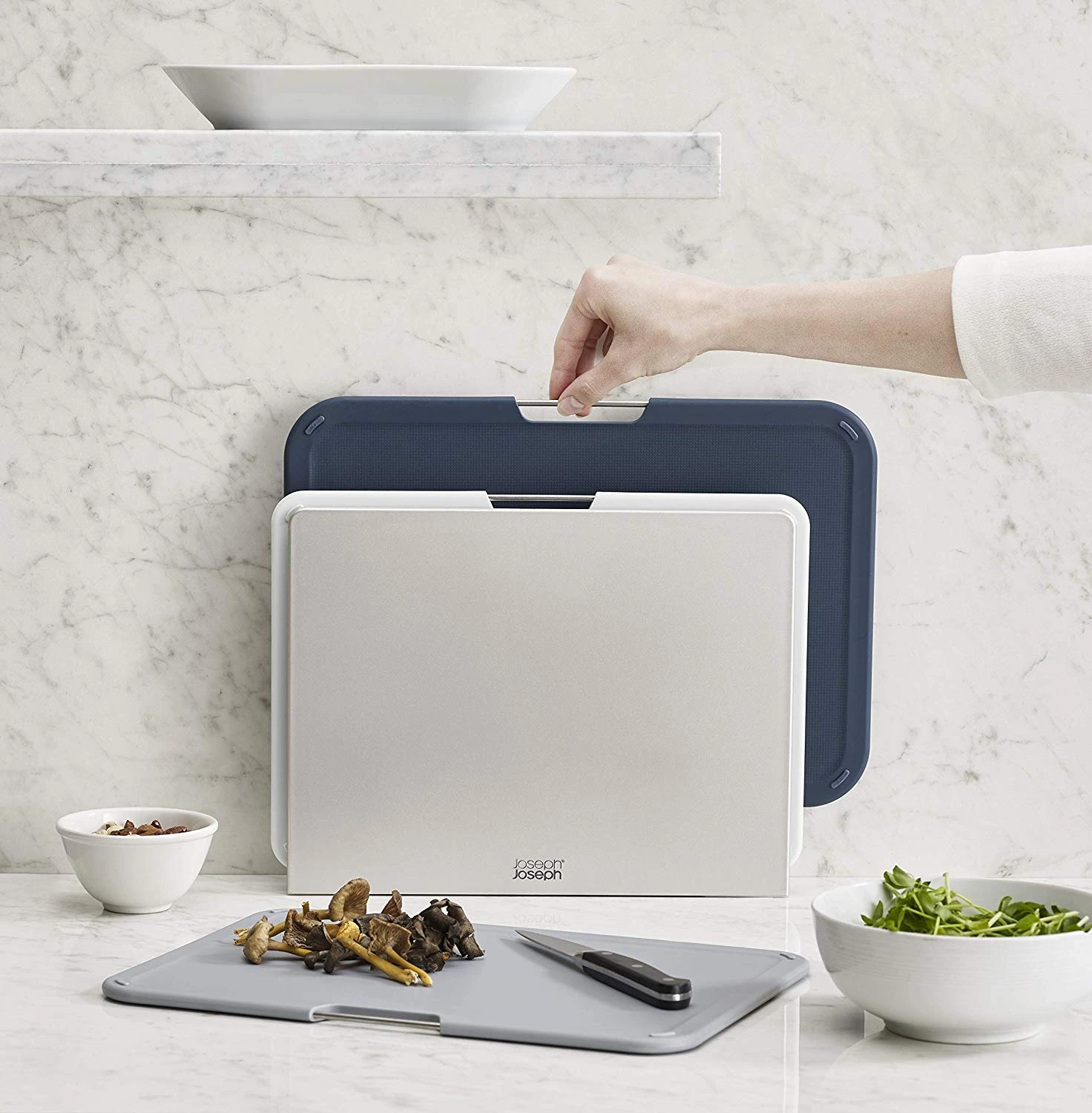 Deze mooie Joseph Joseph snijplankenset wordt geleverd met een handige opbergstandaard. Deze opbergstandaard geeft elke keuken een stijlvolle look en zorgt ervoor dat de snijplanken makkelijk bij de hand zijn tijdens het koken. Elke plank heeft een andere maat die geschikt is voor een reeks aan voedselvoorbereidende taken. De opbergstandaard houdt elke plank uit elkaar, laat lucht circuleren voor een gelijkmatige droging en bevat antislipvoetjes.