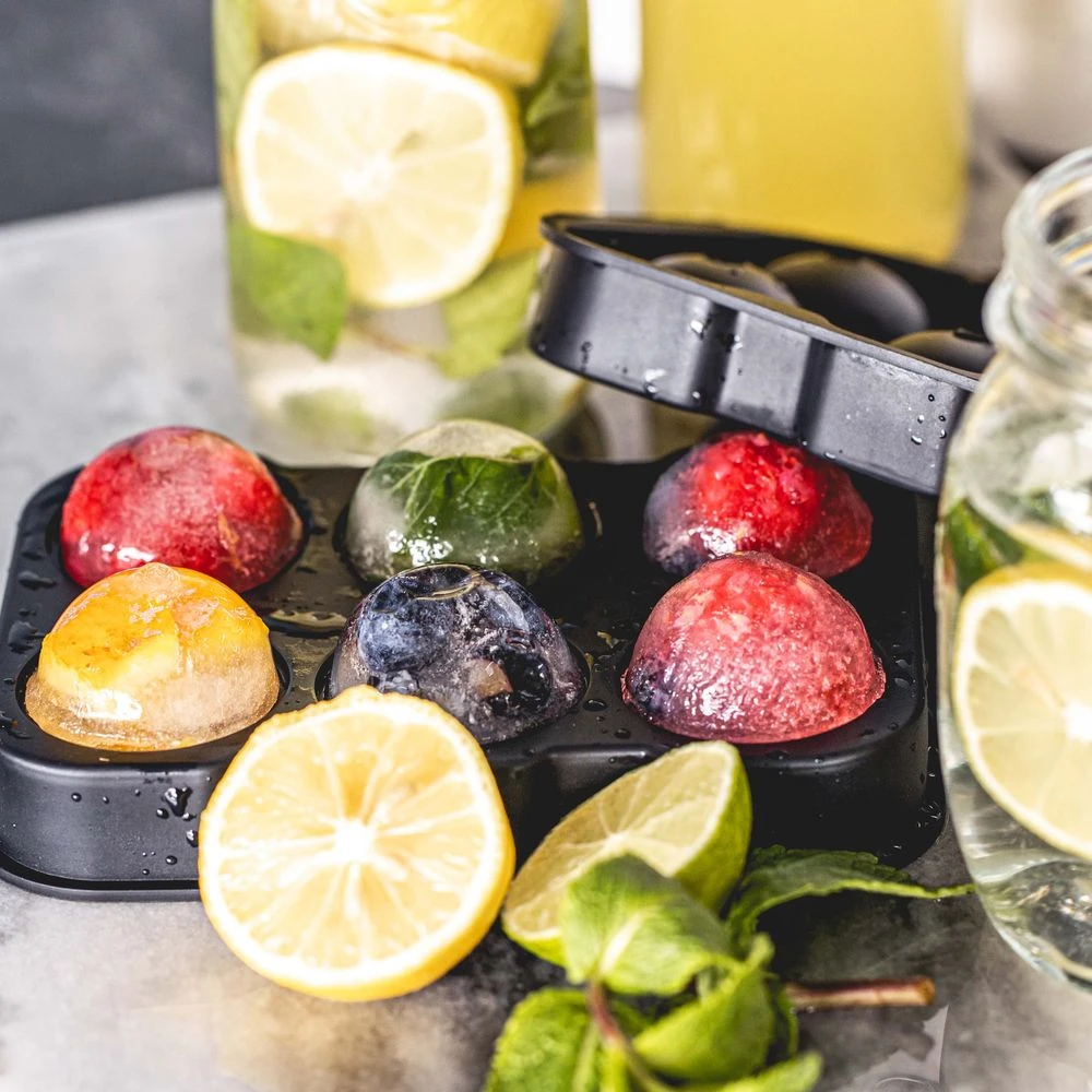 Neem de onderste siliconen helft vast, met de voetjes aan de onderkant. Vul deze helemaal met water tot aan de bovenste rand. Leg de ijsblokhouder voldoende lang in de diepvries. Haal nadien de ijsballen en of ijsblokken eruit. Dit gaat zeer gemakkelijk door de flexibiliteit van silicone. Voor nog meer cocktail fun kunt u de ijsballen of ijsblokken ook een fruitsmaak geven. Door vruchtensap of stukjes van vruchten zoals framboos, aardbei, kers, citroen en limoen aan het water toe te voegen.